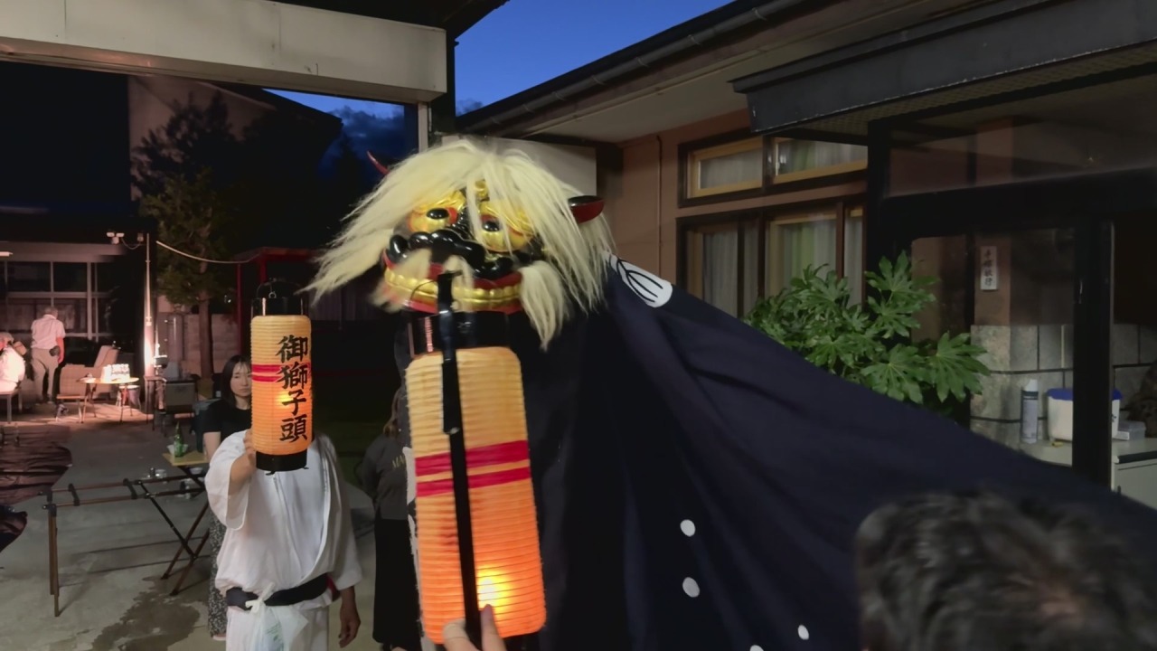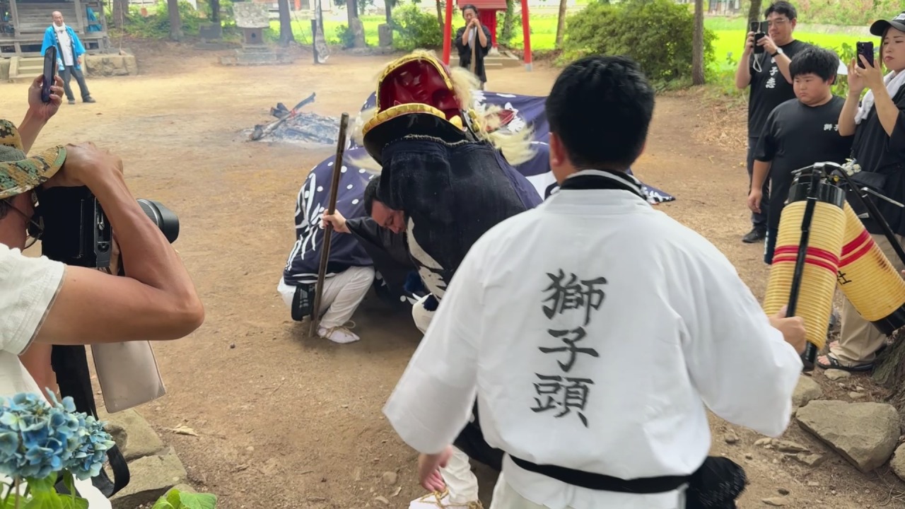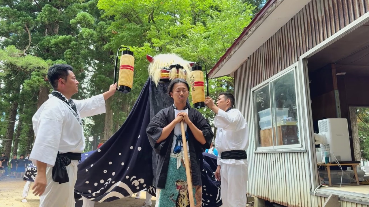 中ノ目八幡神社の獅子舞いは、境内にある月岡神社で子供のころに舞いや笛太鼓を習い、大人になると獅子連に加わることが伝統になっています。