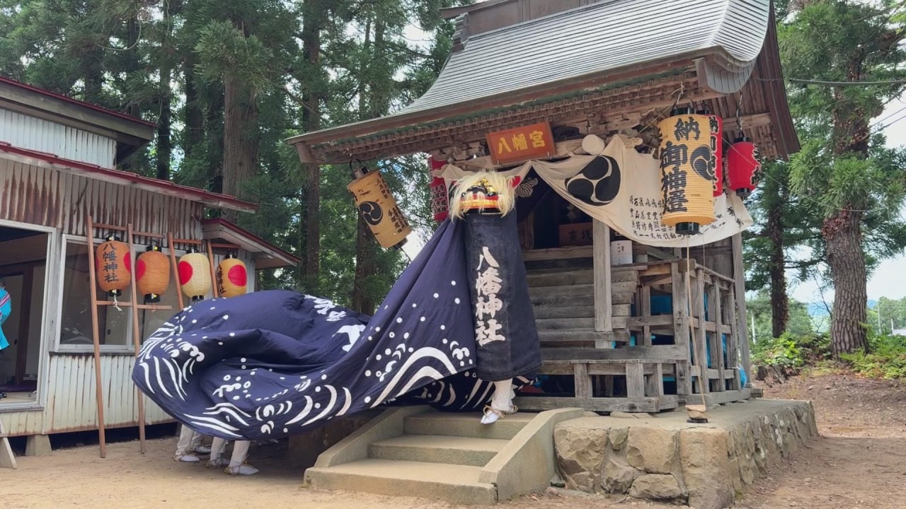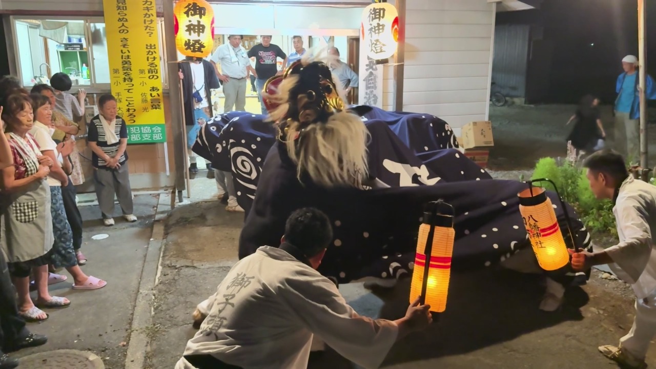 中ノ目八幡神社は萩生の中ノ目というところにある神社です。永禄年間(1558~1569年)に建立されたと伝わり、古い神像が三体祀られており昭和63年に町の文化財に指定されました。あこの獅子は「静と動」の組み合わせが勇ましい獅子舞です。
