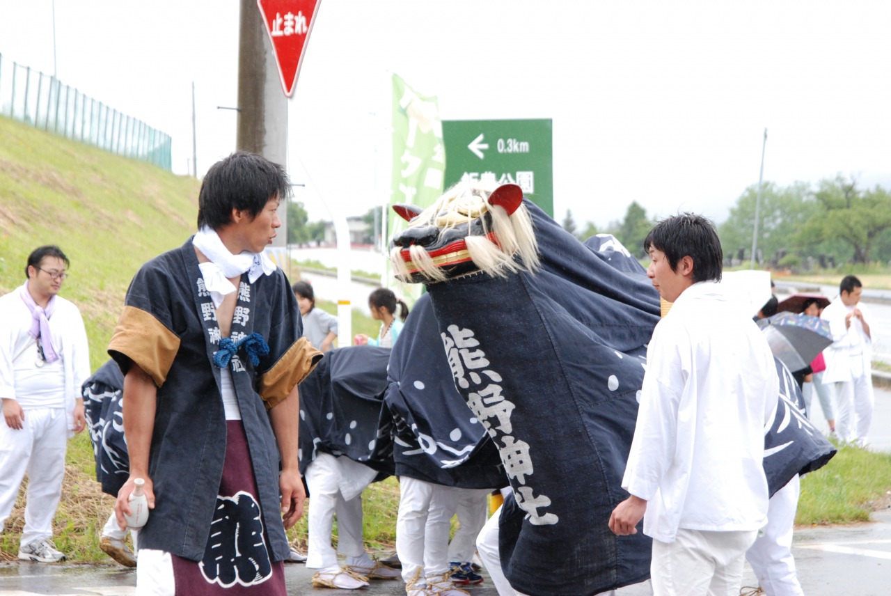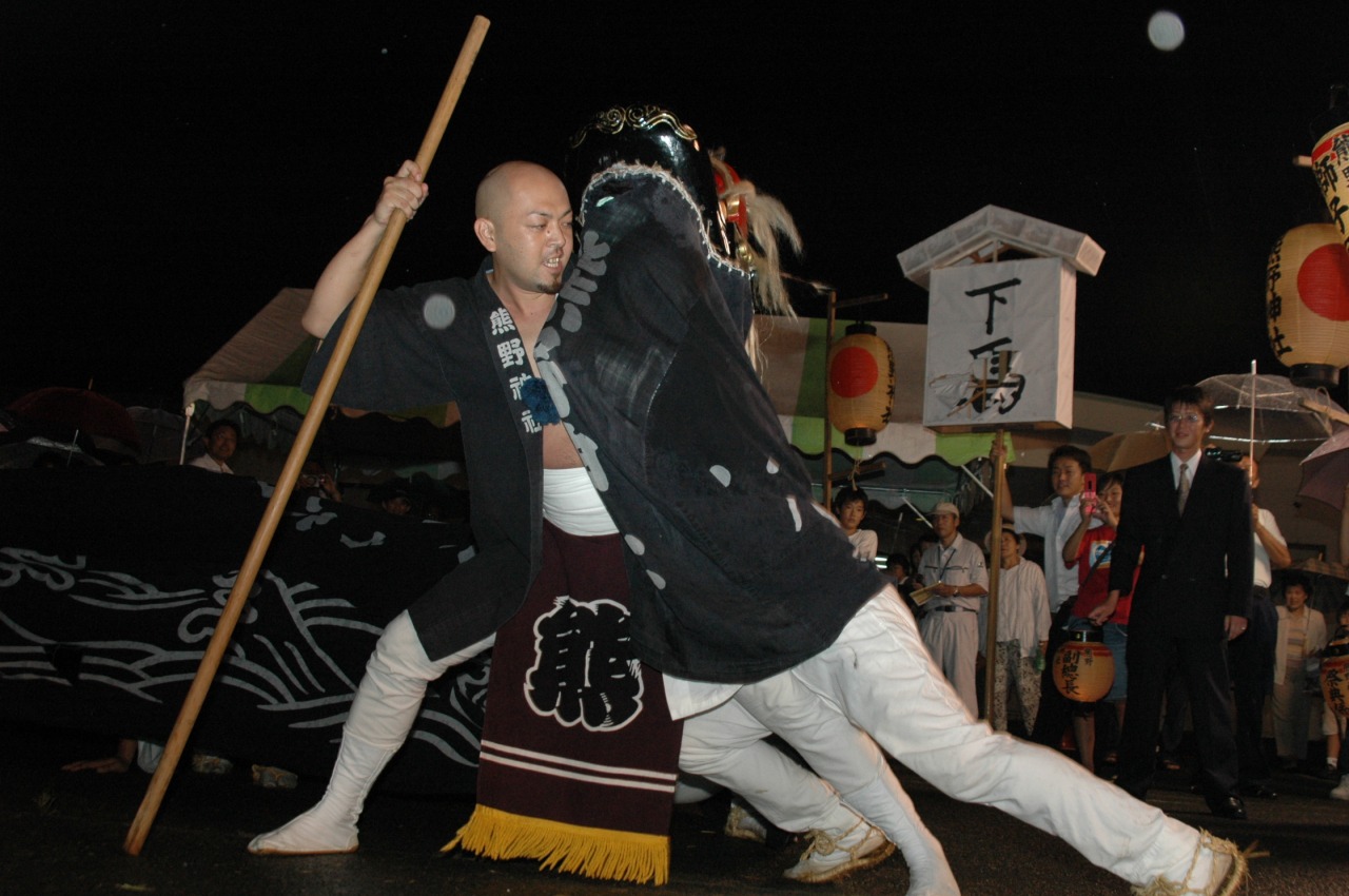 椿熊野神社の獅子舞には、警護が獅子と力比べをする際、警護が警護棒をつま先に上げ御神酒をいただく作法をする特徴がみられます。
